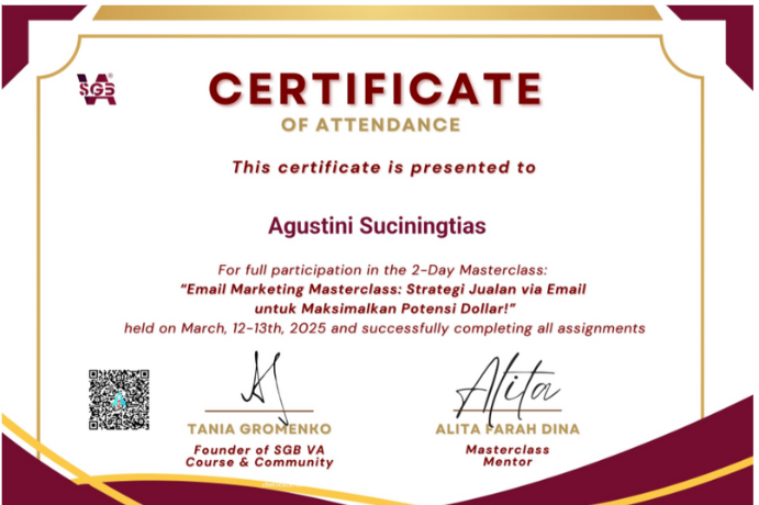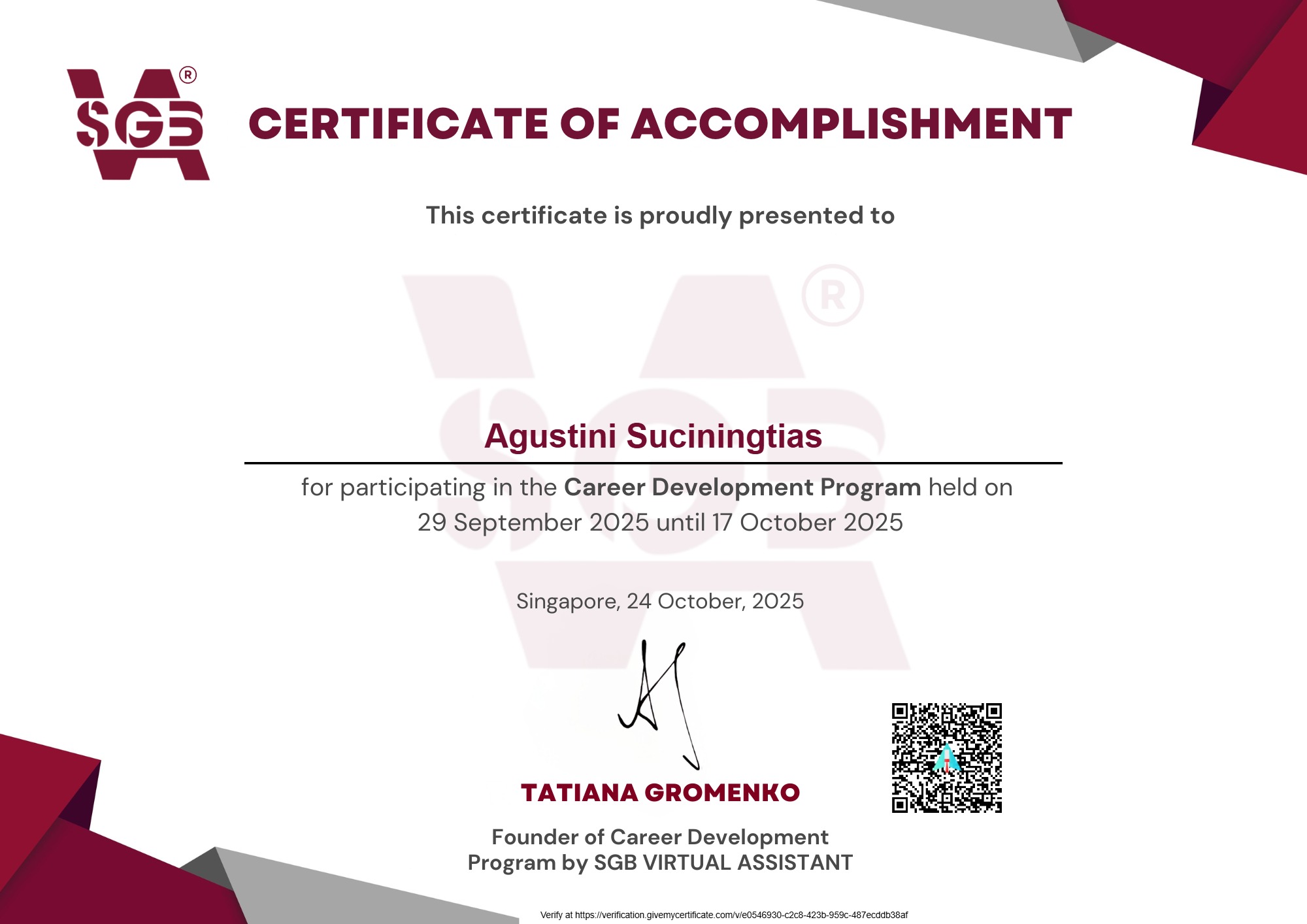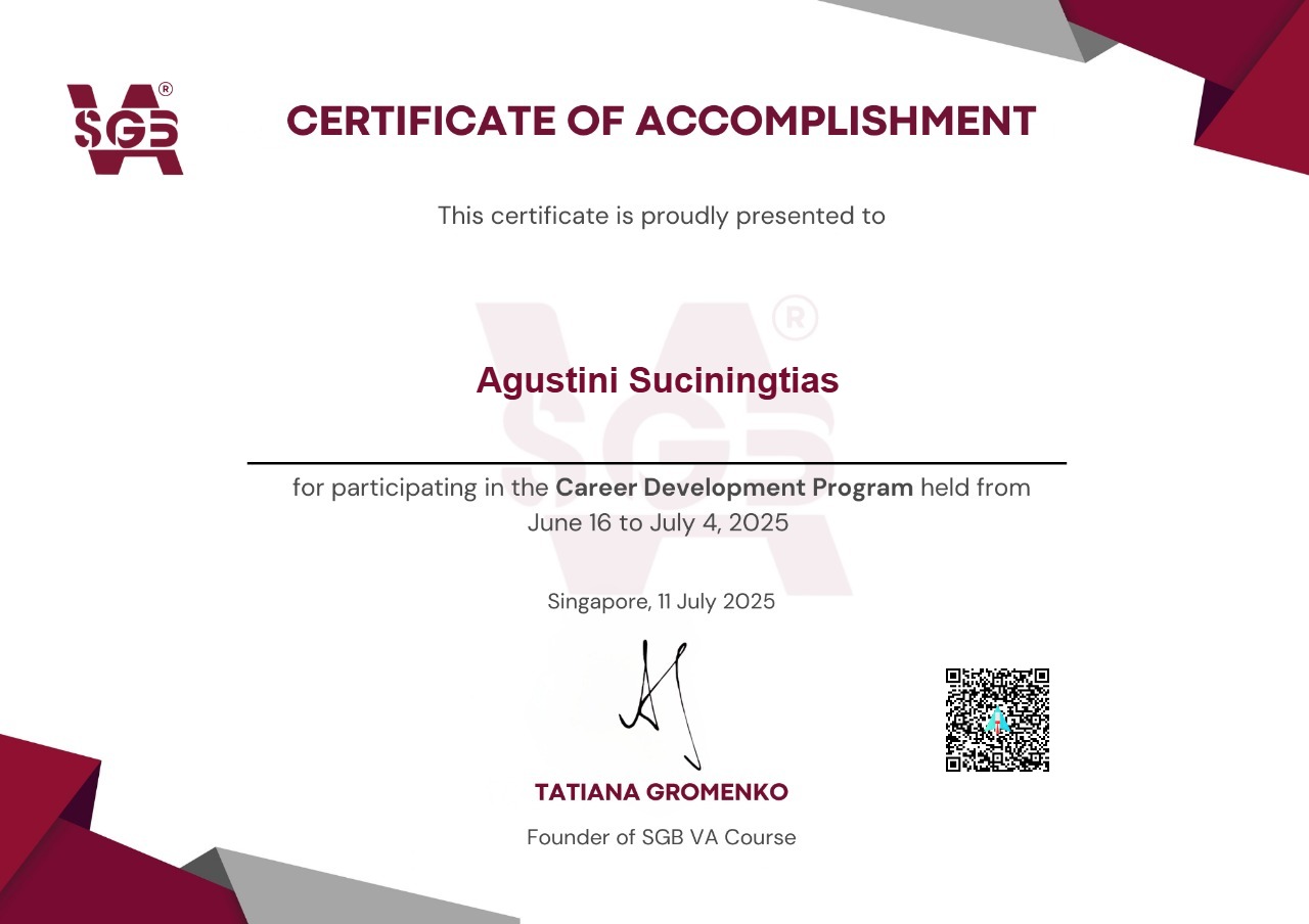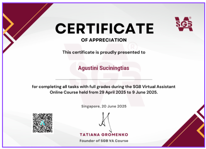 Hi everyone, Iām Agustini Suciningtias, a Virtual Assistant specializing the services I provide include email & calendar management also email marketing.